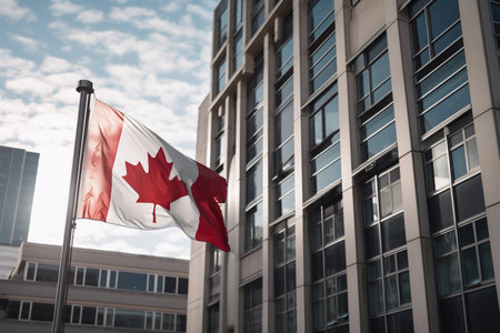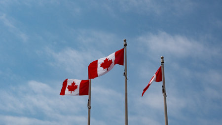 Multiple canadian flags are waving proudly in the wind, mounted on poles in front of a government building, symbolizing national identity and patriotism