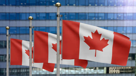 3D illustration Canadian flag waving a modern skyscraper city. Beautiful tall tower with Canada banner blowing soft silk. Cloth fabric texture ensign background. National day and country concept