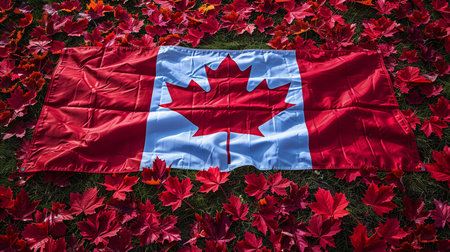 A Canadian flag is spread across lush green grass, surrounded by a carpet of fallen, bright red maple leaves, symbolizing autumn in Canada.