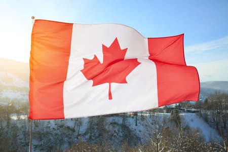 National flag of Canada in mountains on winter day