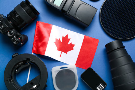 Flag of Canada with photographer's equipment on blue background