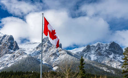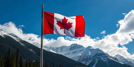 Canadian flag waving in the wind against the backdrop of snow-capped mountains