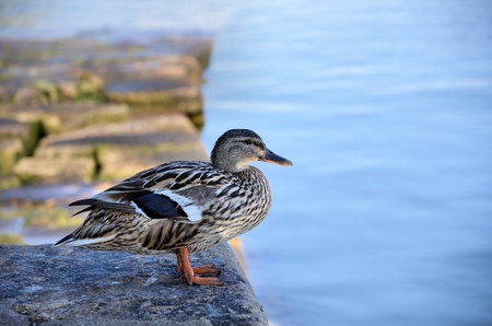duck swimming in the lake. duck on the shore of the lake