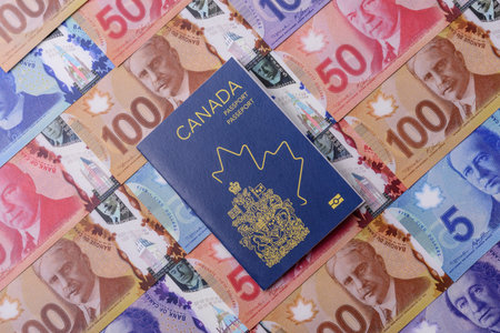 An official passport issued by Canadian government accompanied by Canadian banknotes in currency dollars in various denominations