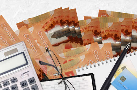 5 Canadian dollars bills and calculator with glasses and pen. Tax payment season concept or investment solutions. Financial planning or accountant paperwork