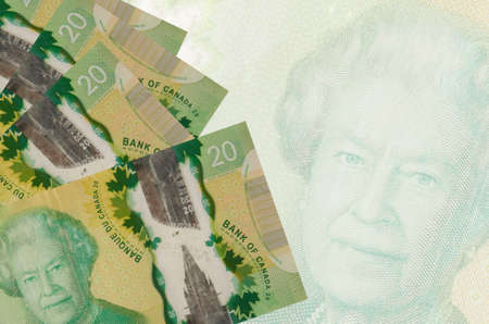20 Canadian dollars bills lies in stack on background of big semi-transparent banknote. Abstract business background with copy space