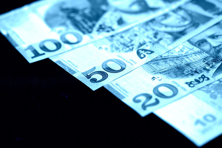 Canadian dollar bills colorful macrophotography close up of bill corners for Canada money exchange concepts.