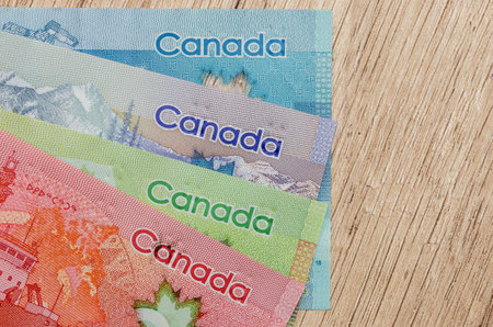 Colorful canadian dollar banknotes on wooden background