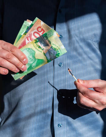 Man holding burning match to Canadian dollars. Illustration of concept of having money to burn.