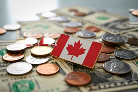 Canadian flag pin resting on us dollar bills surrounded by various coins