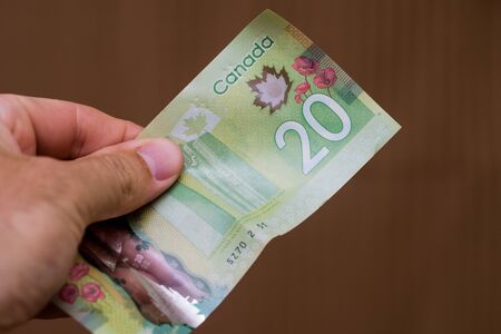 Persons hand giving the Currency of the Canada - One green twenty dollar notes spread out on a brown background. Money exchange.