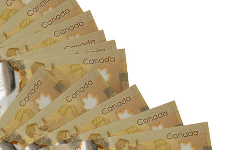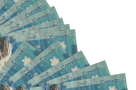 20 Canadian dollars bills lies isolated on white background with copy space stacked in fan shape close up. Financial transactions concept