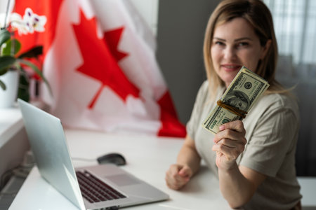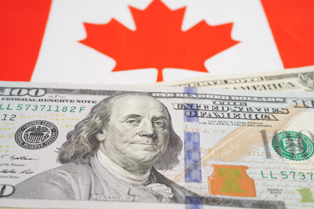 Canadian flags overlapping us dollar bill with benjamin franklin portrait.