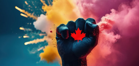 Canadian flag painted on a clenched fist. The concept of the fight against the coronavirus.
