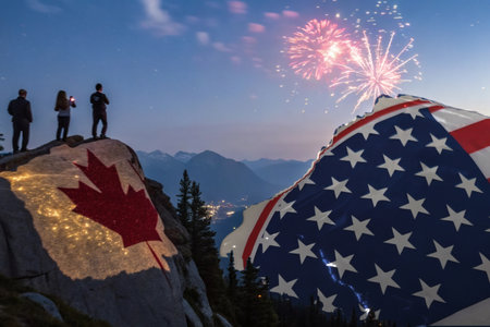 Spectacular scene of people climbing mountains at dusk to watch fireworks, with one mountain illuminated as a map of America and another as a map of Canada, creating a breathtaking view.
