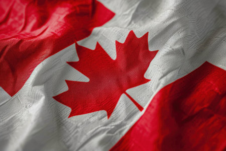 Closeup detailed texture of canadian flag with vibrant red and white colors, showcasing the iconic maple leaf emblem