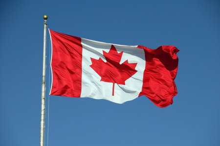 Vibrant canadian flag flutters in the wind under a clear blue sky