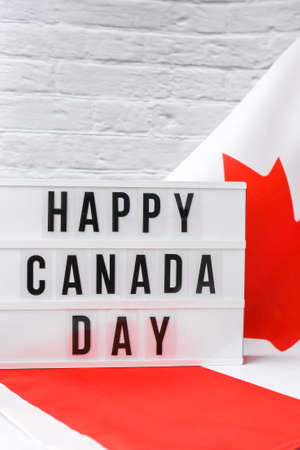 The National Flag of Canada. Lightbox with text HAPPY CANADA DAY Canadian Flag or the Maple Leaf. Patriotism. International relations concept. Independence day