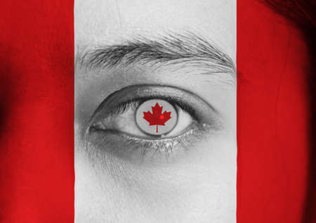 Human face painted Canada flag with the red maple leaf on the center of eye or eyeball. Human eye painted with flag of Canada.