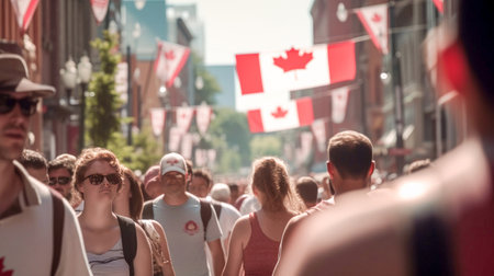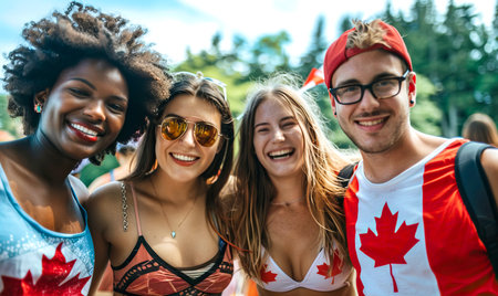 Young diverse adults celebrating Canada Day on streets of Canada. Happy tourists visiting Canada. Summer vacation. Generative ai
