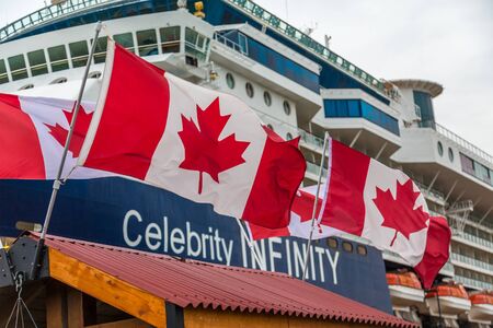 OTTAWA, CANADA - NOVEMBER 12, 2018: Canada Wordmark, the official logo of the Canadian government, on an administrative building next to a Canadian flag waiving