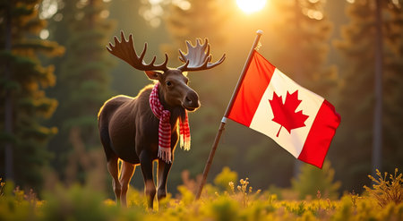 Poster for Canada Day with amazing moose and canadian flag standing in the sunny forest, festive and freedom mood