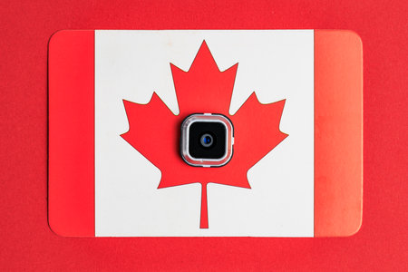 Compact camera on canadian flag background: symbol of technology and national pride.