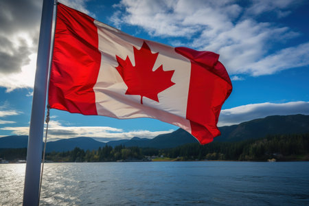 Canadian flag waving in the wind against scenic view of lake and mountains, Canada flag and beautiful Canadian landscapes, AI Generated