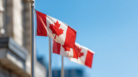 Multiple canadian flags are waving proudly in the wind, mounted on poles in front of a government building, symbolizing national identity and patriotism