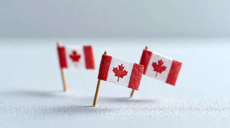 Three miniature canadian flags are standing on toothpicks on a textured white surface, creating a patriotic display representing canadas national identity and celebrating its cultural heritage