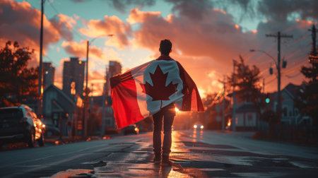 A person draped in a Canadian flag walking down a street at sunset, with warm and peaceful lighting