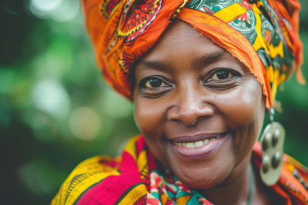 Portrait of a smiling woman with a vibrant african headwrap against a green backdrop