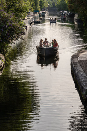 London, UK - Jun 21, 2025 - Tourist are relaxing on a boat in Little Venice in West London at evening, It is the junction point of the Grand Union Canal and the Regent's, its tranquil canals and waterways lined with narrowboats and houseboats. use it as your Wallpaper, Poster and Space for text, Selective focus.