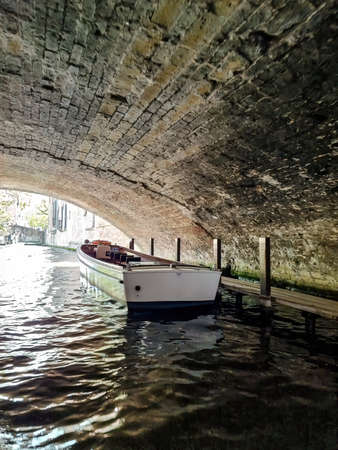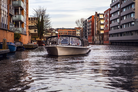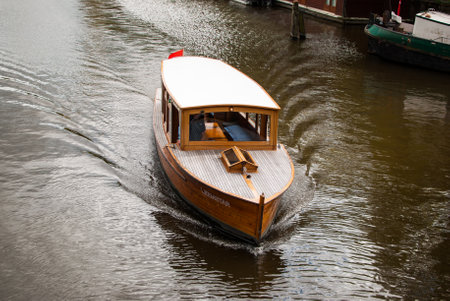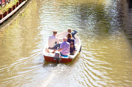 Utrecht, Netherlands - November 14, 2019: People in a small motorboat in the Utrecht canal