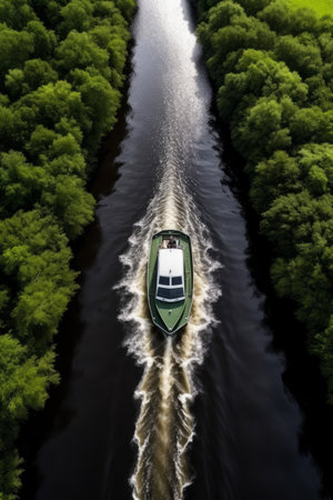A vibrant boat glides smoothly along the river, creating gentle ripples in the water under a bright sky.