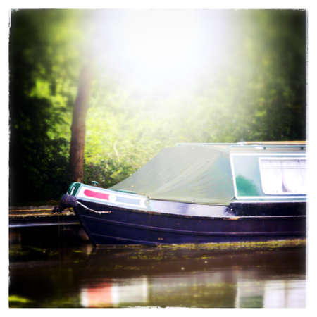 Moored boat and buildings lit by the sun on a water channel in Edinburgh. Union Canal, Edinburgh, Scotland