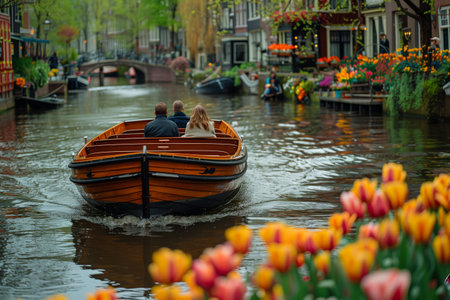 Wooden boat gliding through a canal surrounded by vibrant tulips, quaint houses, and picturesque bridges on a serene spring day