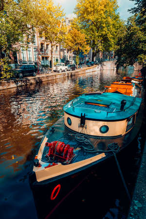 Traditional cruising tour boat moored tied up in one of the famous Amsterdam canals on the beautiful, sunny autumn day