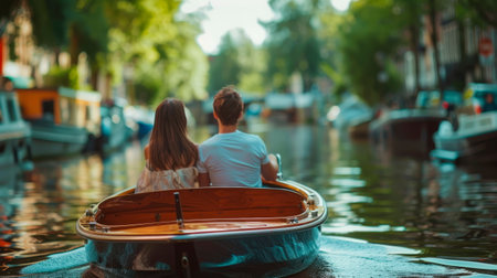 Father and son enjoying a peaceful boat trip along a picturesque canal in Amsterdam, Netherlands, creating lasting memories together
