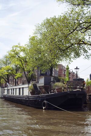 Amsterdam, Netherlands - April 1, 2016: Traditional boat house, canal, bridge in Amsterdam, Holland