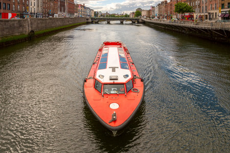 Tourist boat making its journey on the liffey river through the center of Dublin