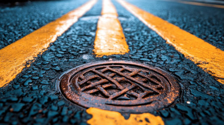 A close-up photo capturing a round manhole cover embedded in a textured asphalt road adorned with vibrant yellow stripes, showcasing urban infrastructure.