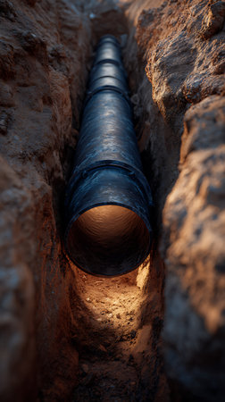 A large diameter, segmented pipe runs through a narrow trench cut into sandy soil. Interior of the pipe glows warmly, contrasting sharply with the dark exterior.
