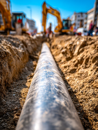 A busy urban construction site featuring workers in safety vests, large pipes laid in a muddy trench, and machinery working on infrastructure improvements.