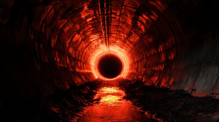 A captivating underground tunnel with a glowing red hue creates an eerie atmosphere, reflecting light on the water. This image evokes mystery and exploration.