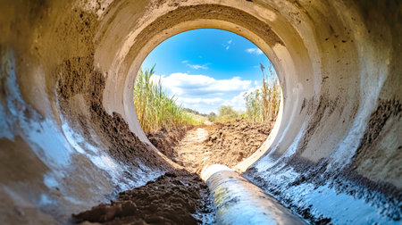 Captivating abstract view of a concrete pipe with glowing light at the end, surrounded by rich earth, creating a stunning perspective in a natural setting.