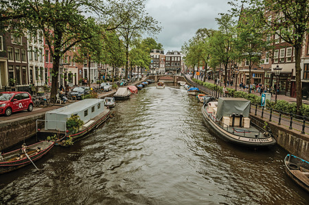 Tree-lined canal with brick buildings, moored boats and cloudy sky in Amsterdam. Famous for its huge cultural activity, graceful canals and bridges.