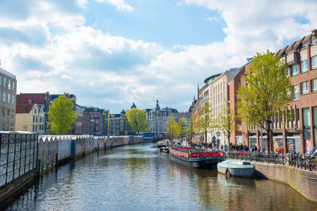 Boat on river Amstel in Amsterdam Netherlands landmark old european city landscape. Picturesque cloudscape