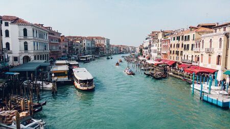 Venice, Italy - May 21, 2022: Boats, gondolas and water taxis navigating through Grand Canal and the buildings from Rialto bridge in Venice, capital of Veneto region and a famous travel destination.