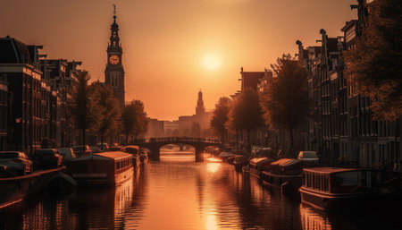 Canal reflecting the golden light of sunset on the traditional dutch houses of amsterdam, netherlands